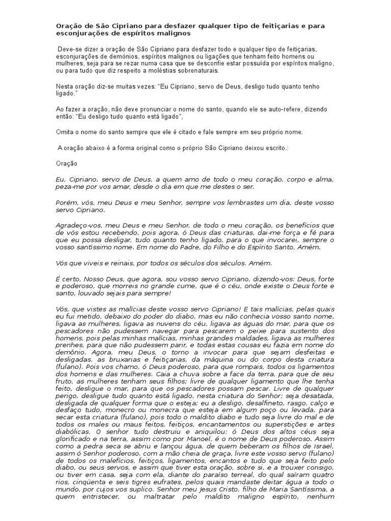 Vós, que vistes as malícias deste vosso servo cipriano! Arquivos de áudio da ona : São cipriano, trazei muito dinheiro, riqueza e fortuna pra mim. São cipriano, que (nome da pessoa) pense em mim em todos os momentos de sua vida. A oração de são cipriano para desfazer feitiços é muito poderosa, ela consegue desfazer qualquer tipo de feitiço e esconjurar espíritos malignos.